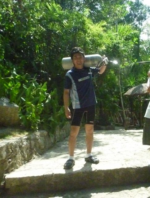 バックマウントのダブルタンクと違い、大きなタンクも一本ずつ、運べるからジャングルの中でも運搬が簡単なのが、このサイドマウントのいいところです。