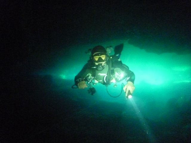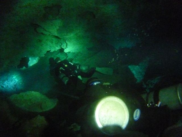 セノーテとは、メキシコのユカタン半島にある地下水脈です。6500万年前に、恐竜などを絶滅させたといわれる隕石衝突でできたチクシュルーブ・クレーターの外輪上にできた溝に石灰岩質の土壌が堆積していき、長い時を経て、降った雨が地中にしみこみ、もともとの土壌と石灰岩質の土壌との間に大きな鍾乳洞が出来ていきました。その後、空洞の上の土が何箇所も陥没し、地中でつながった大きな泉がいくつもできました。しかも深い部分でカリブ海とつながっていて、淡水と海水が交じり合うハロクライン現象がみられます。この洞窟は、陥没した入り口、泉(セノーテ)からダイビングできるのです。セノーテはユカタン半島に300箇所あるそうで、クリスタルブルーと呼ばれる水は透明度が高く、白い鍾乳石に囲まれた景色は、幻想的でとてもすばらしいです。今回は、グランセノーテ、チャックモールなど有名なところも含め、いろいろなケーブシステムを潜りました。そして今回は、背中にタンクを背負う通常のバックマウントと呼ばれるスタイルではなく、体の横、左右にタンクを装着するサイドマウントをやりました。背中にタンクがないことで、今まで、進入できなかった、穴まで、すすむことができます。