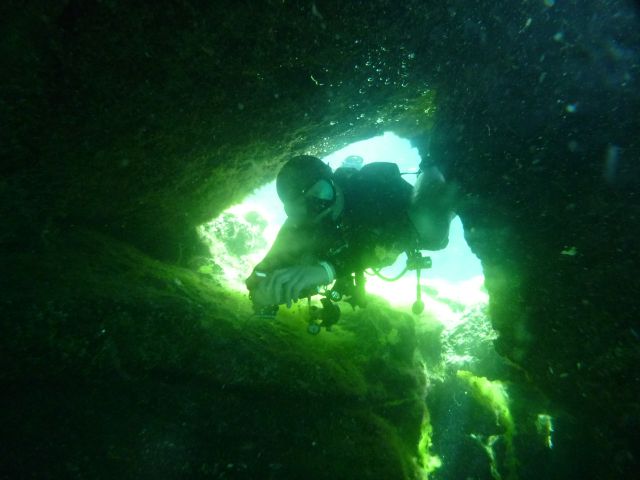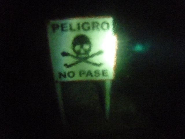 光の差すカバーンエリアから、暗黒のケーブエリアに入るところには、一般ダイバー進入禁止の看板が入っています。ドクロマークや死神マークがあります。