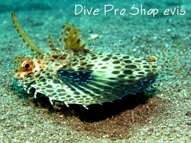 [特徴]水底を這うように移動し、足のような、ひれが変化したであろう器官で地面を歩くような行動をとる。胸鰭も大きく丸い。胸鰭に目のような模様があり自信を大きな生物のよう見せるための擬態だと考えられている。類似種にホウボウがいるが尾鰭の模様がエメラルドグリーンのような色合いで見た目が違うので判別がしやすい。食用にもなり、すしネタになることがある。2020/05/03