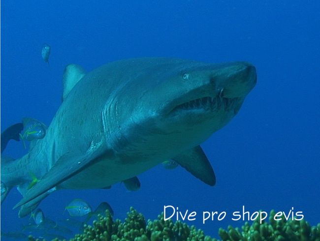 [学名]Carcharias taurus [分類]軟骨漁網-板鰓亜綱-ネズミザメ目-オオワニザメ科【シロワニ】 [英名]Sand tiger shark [体長]最大で全長320cm、 [体重]158.8kg [生息地]冬季小笠原、全世界の温帯・熱帯の海に生息 歯牙状で列になって立ち並んだ歯には良い印象は受けにくいですが、シロワニは見かけによらず大人しく攻撃事例はかなり少ないのです。一部地域では個体数が少なくなっていて、絶滅の危機に瀕しています。
