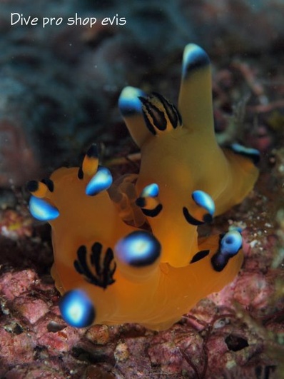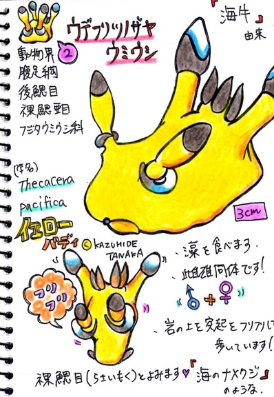 [撮影地] 西伊豆 田子 [撮影者] リック [学名]Thecacera pacifica [分類]裸鰓目ードーリス亜目ーフジタウミウシ科 [和名]ウデフリツノザヤウミウシ 腕振角鞘海牛 [体長]約3cm [生息地]インド洋と西太平洋およびメキシコ湾 [英名]Pikachu nudibranch 見た目がピカチューに似ていることからダイバーの間では「ピカチュウウミウシ」や「ピカチュウ」の愛称で呼ばれています。 ウミウシウォッチングブームの火付け役といってもいい人気者です。
