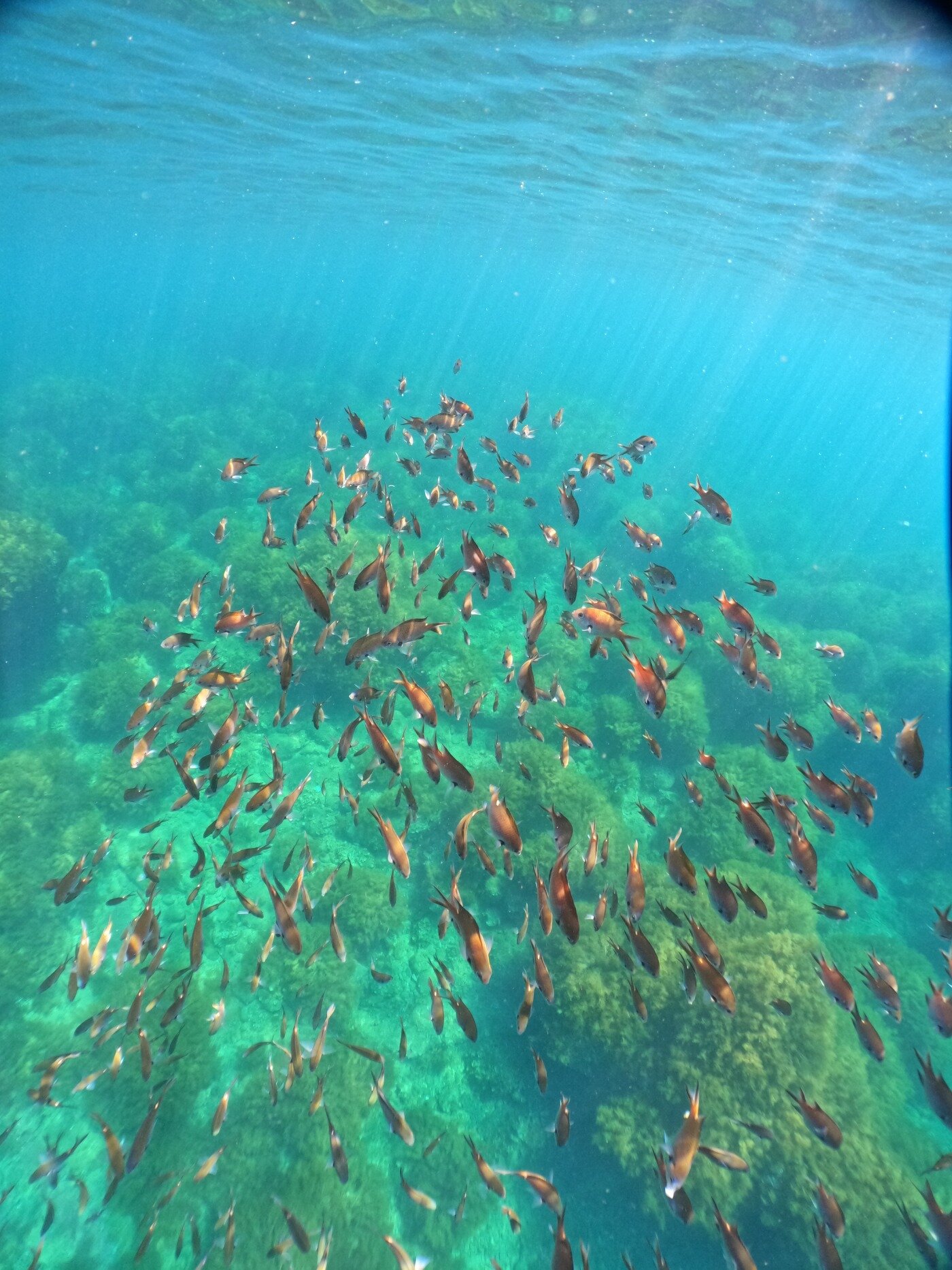 水面でスズメダイに囲まれて