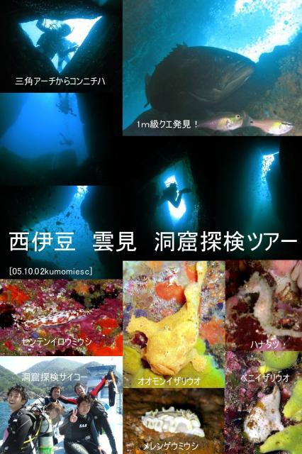 [天気]晴れ[気温]27℃[ポイント]牛着岩[水温]23℃[透視度]10-15m[海況]多少うねりあり[生物やトピックス]今回はもりもり3本潜ってきました〜一本目は三角アーチからHホールを抜け、24アーチそして回転L字アーチそしてHホールから三角アーチとメインの洞窟を探検。Hホールの中には1mクラスのクエ発見!回り込み大半の人が間近に見ることができました。テングダイ、イシダイ老成魚。2本目は子牛の砂地を回り行き止まり洞窟へ行き止まりから差し込む光がキレイです。そして戻るときの青く光る入り口はいつ見てもきれいですね。イセエビ、ハタンポ、トラウツボ。3本目はイザリ、タツフィーバーの子牛の内海でフィッシュウォッチング!ベニイザリウオ(オレンジ)、オオモンイザリウオ(イエロー)イロイザリウオ(ホワイト)ハナタツ(ホワイト)コロダイ(大)コケギンポ ウミウシもいろいろ(センテンイロウミウシ メレンゲウミウシ アオウミウシ スミゾメミノウミウシなど)☆来年は学生レスキューダイバーで伊豆半島最強スポット神子元へ行きましょうね! [担当]だいすけ だいゆう[写真/撮影者]tapioka&daiyu