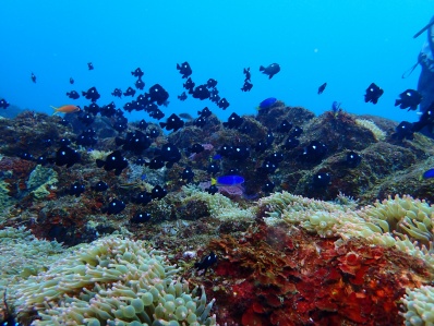 ・I高nさん・・・岩のトップにいるミツボシクロスズメダイと仲間たちを綺麗に青抜きで撮影出来た清々しい作品だと思います。
