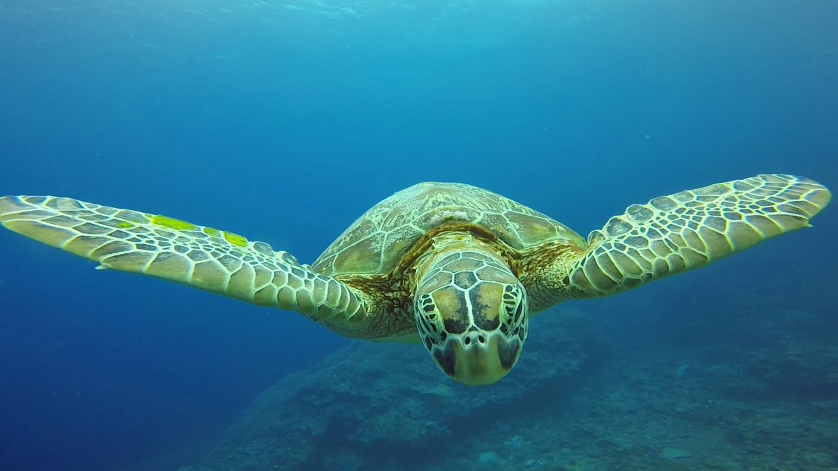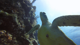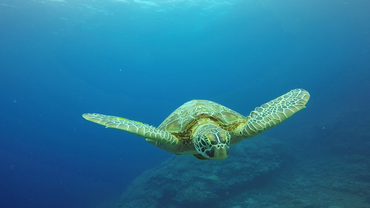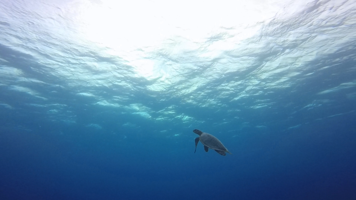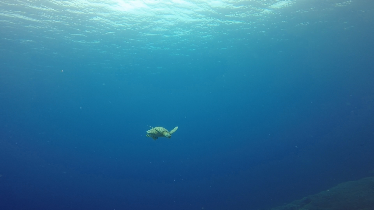 遠くの水面にアオウミガメ確認!