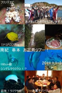 担当だいすけ、たけ。メンバーは2年連続参加のあさP、東京より参加!I井さん、串本初参加のすーさん、O味さん、パープル改めシンデレラウミウシさん!そして紅一点いってぃのスタッフ合わせて計8名で初潜り&初詣いってきましたー♪