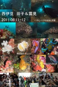 [雲見 軍艦岩~牛着岩] 二本目はコースを悩みましたが、透明度もいいので綺麗な砂地を眺めに軍艦岩からエントリーします。水底の砂模様がきれいでした。軍艦を一周して、砂地と洞窟をくぐり、大牛の洞窟ではコロダイの老成魚やオトヒメエビ、大群のキンメモドキをみました。水路に戻ると、ハナタツを発見。黄色いかわいいのと、皮弁の立派な赤いのがいました。