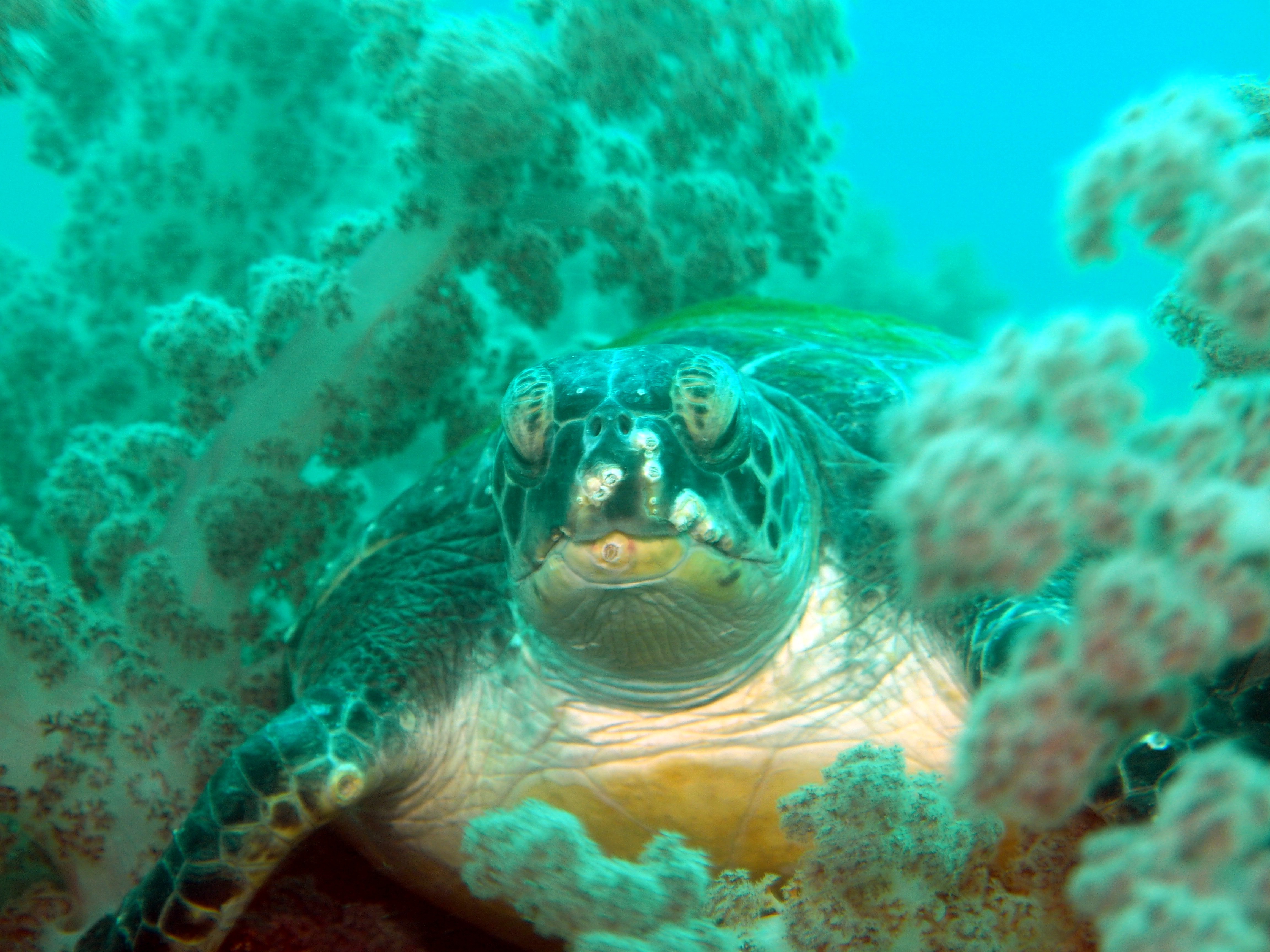 そんな中、生物を探しながらゴロタを進むと目の前に大きなヒレ、甲羅!!アオウミガメがゴロタの上でお昼寝中でした。サツマカサゴも近くの岩の上でのんびり休憩中。