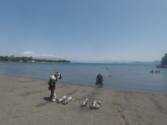 初日は、陸上で手順の練習。海では器材の装着に慣れること、適正ウエイトチェックを行い、浅場で集中的にトリムをとること、基本スキルを練習しました。