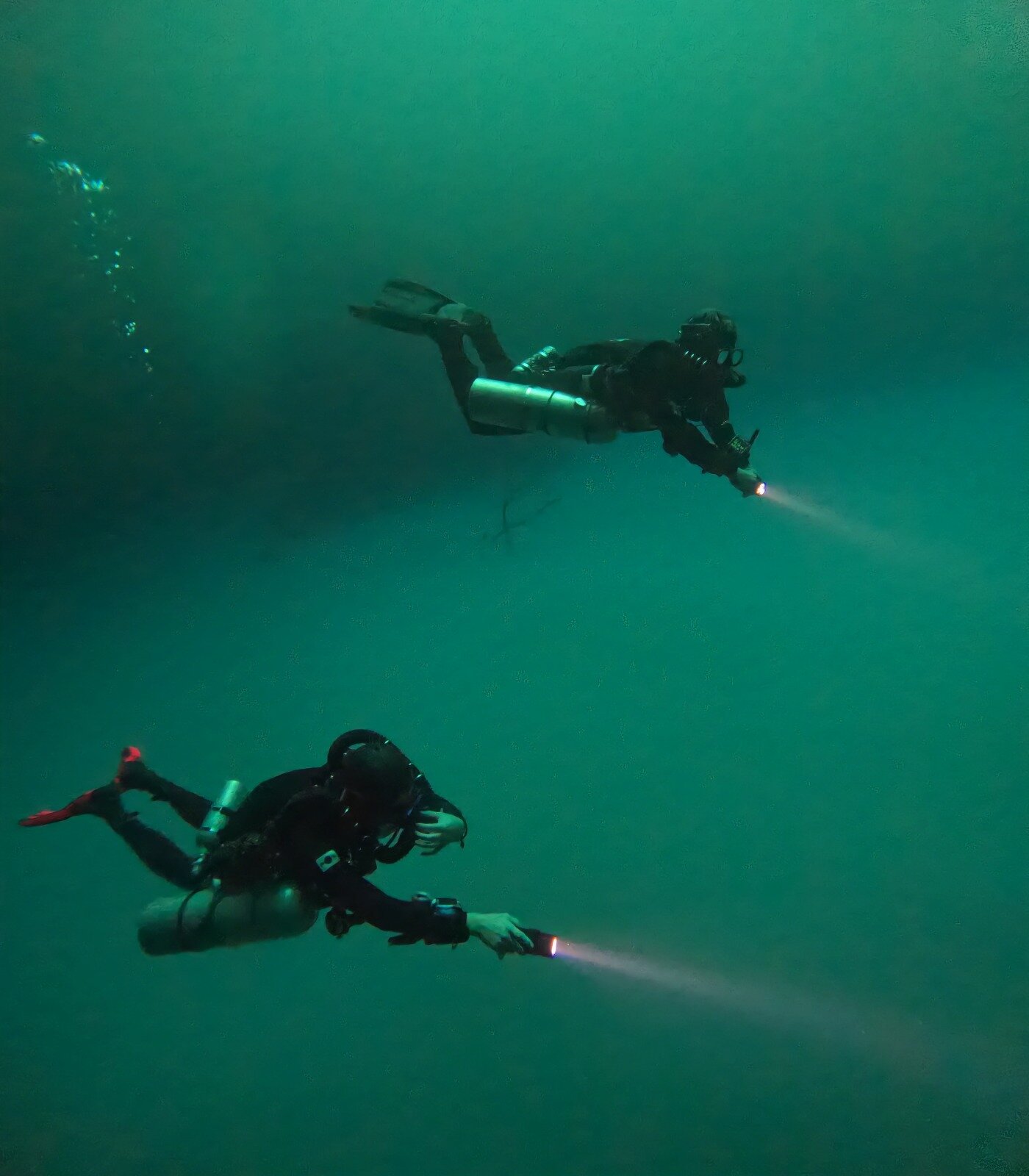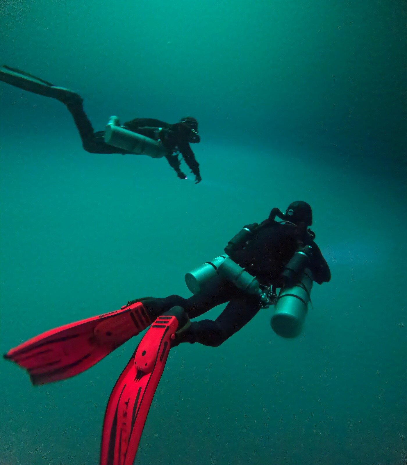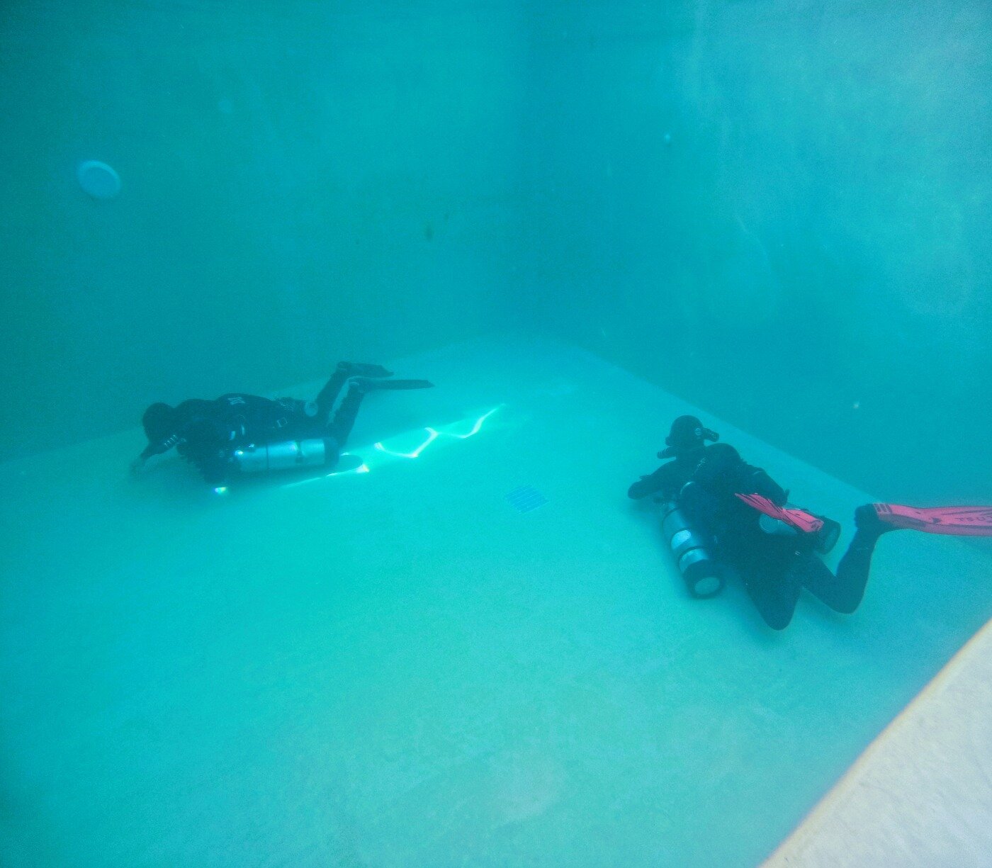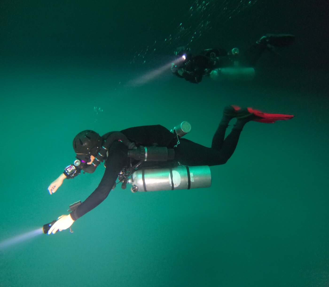 はじめてリブリーザーを扱った松永さんは、3日目までは、講習が終わったら、購入したユニットを売ってしまおうかと思っていたそうです(笑) リブリーザーはこれまでオープンサーキット長くやっていた人のが、かえって感覚的に戸惑うものです。しかしサイドワインダーの取り扱いのしやすさも味方し、そして普段からサイドマウントを扱うプロフェッショナルの方で、素晴らしい上達ぶりで、講習の中盤には形になっていきました。おなじくTsuttiさんもテクニカルインストラクターとしてたくさんのトレーニングを行ってきた方でサイドワインダーを探求しどんどん完成させていきました。